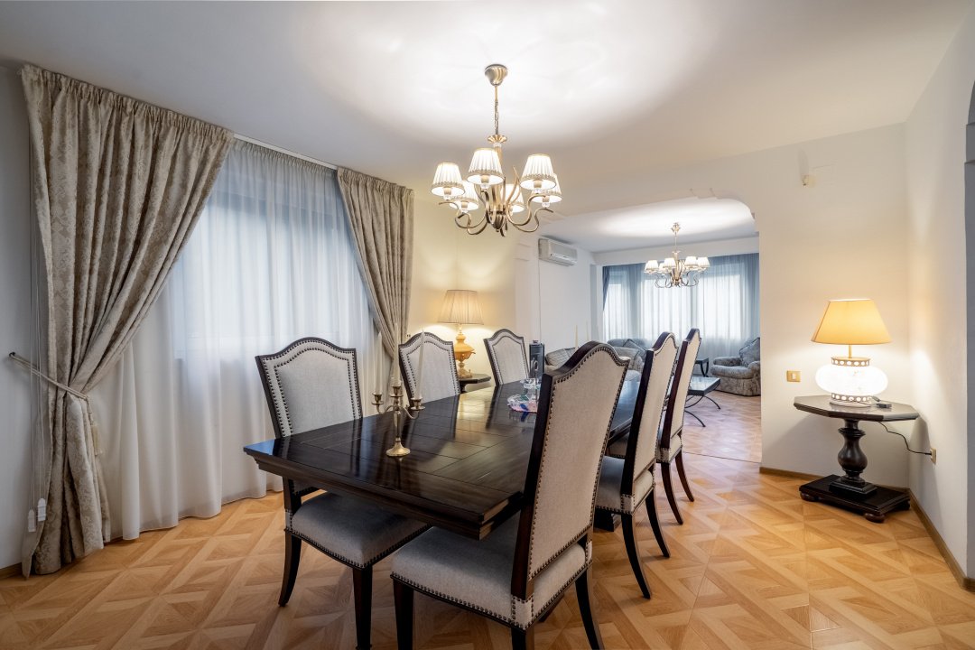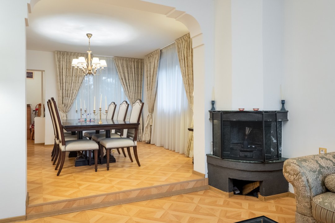 Living amplu și luminos, cu șemineu autentic și zonă de dining, locul perfect pentru seri relaxante în familie sau pentru a primi invitați.