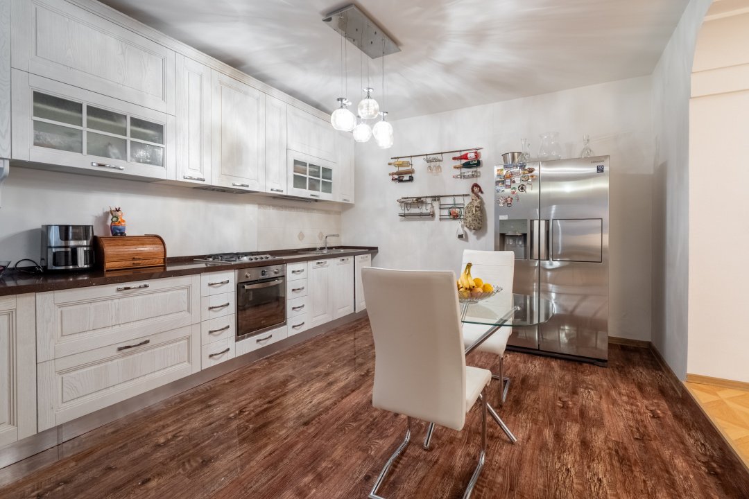 Bucătărie deschisă, modernă, integrată armonios în zona de zi.