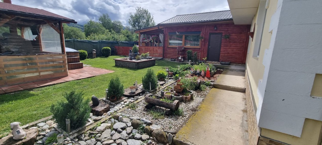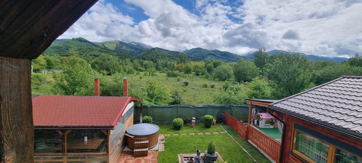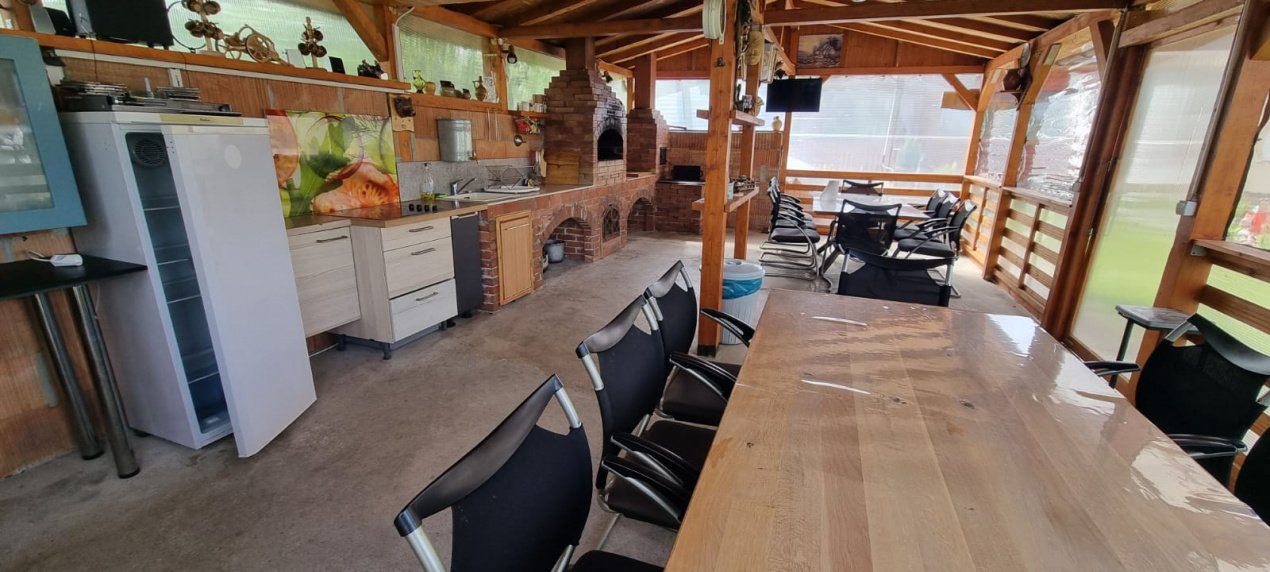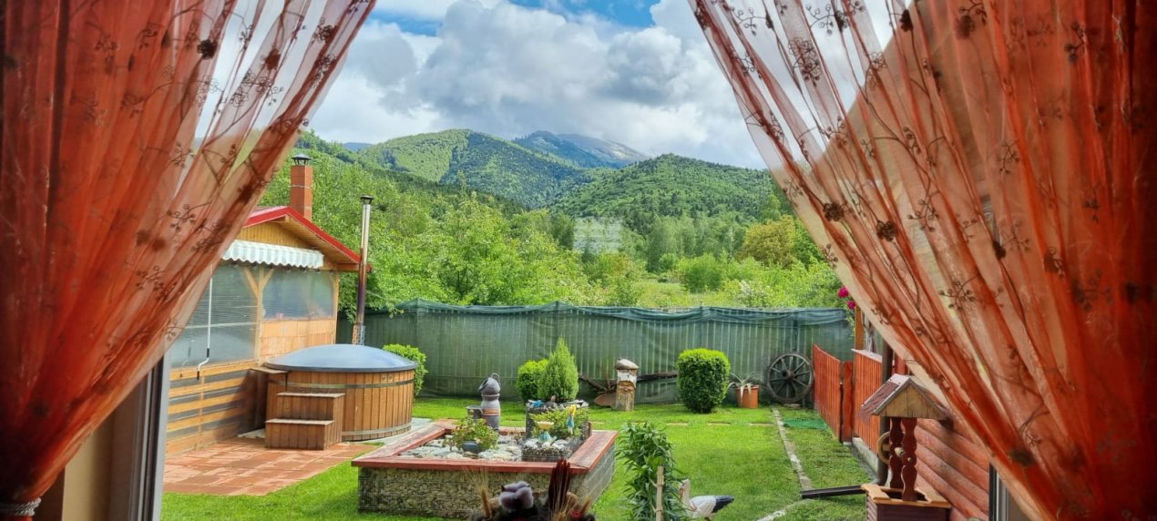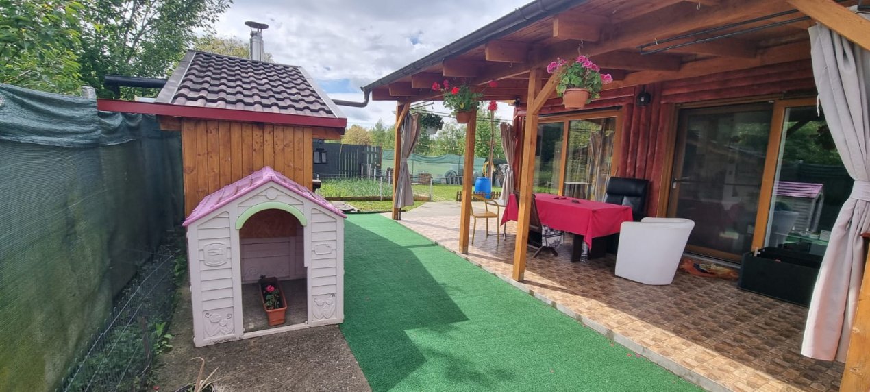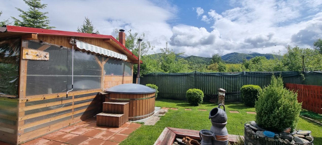 EXTERIOR IMOBIL: Cabanuta din lemn incalzita, cu terasa acoperita, un dormitor cu bucatarie open space si baie proprie, foisor mare cu gratar, plita si chiuveta, afumatoare, cuptor de paine, ciubar pe lemne, balansoar, fantana arteziana, aranjamente florale.