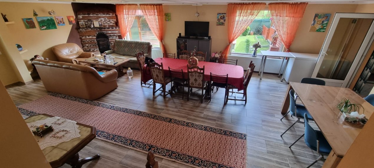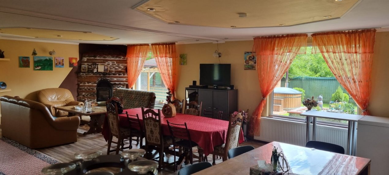 DETALII TEHNICE: Pensiunea dispune de incalzire cu centrala pe lemne si calorifere in fiecare camera, curentul electric este trifazic, panouri fotovoltaice cu sistem de stocare si contract de prosumator, sistem de supraveghere video, put cu hidrofor si bazin de stocare apa.