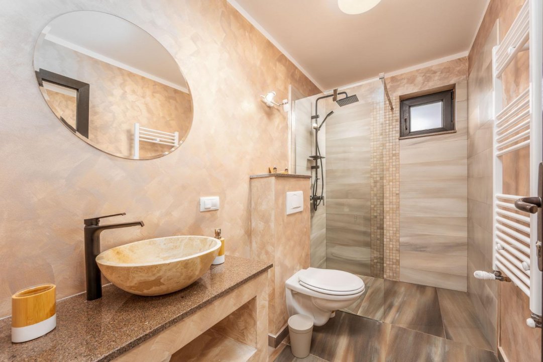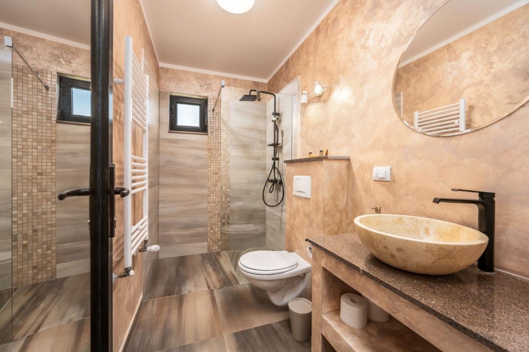 Bai private in fiecare camera, dotate cu obiecte sanitare moderne, cabina de dus tip walk-in si finisaje elegante. Smart TV, Wi-Fi si sistem de incalzire eficient. Spatiu bine gandit pentru sedere si confort pe termen lung. Camerele transmit o atmosfera calda, relaxanta, perfecta pentru turisti care cauta liniste si calitate. 2 dintre camere pot acomoda familii cu copii, celelalte sunt duble matrimoniale.