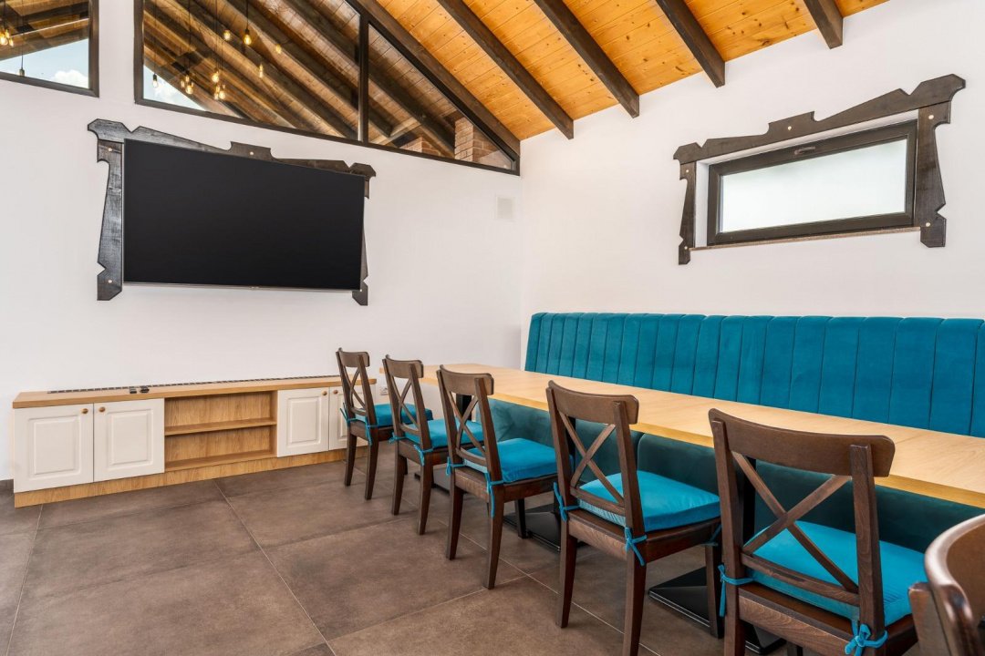 Pavilion de tip foisor inchis, generos cu zona de servire a mesei si ideal pentru petreceri private. Totul este amenajat cu foarte mult bun gust, atentie la detalii, materiale si finisaje de calitate. Bucatarie complet utilata. Terasa spatioasa si curte amenajata cu pavele, usor de intretinut. Parcare privata. Panouri solare capacitate 18 kw. Pompa de caldura capacitate 20. Cheltuieli minime de intretinere. Acces rapid la toate atractiile zonei.