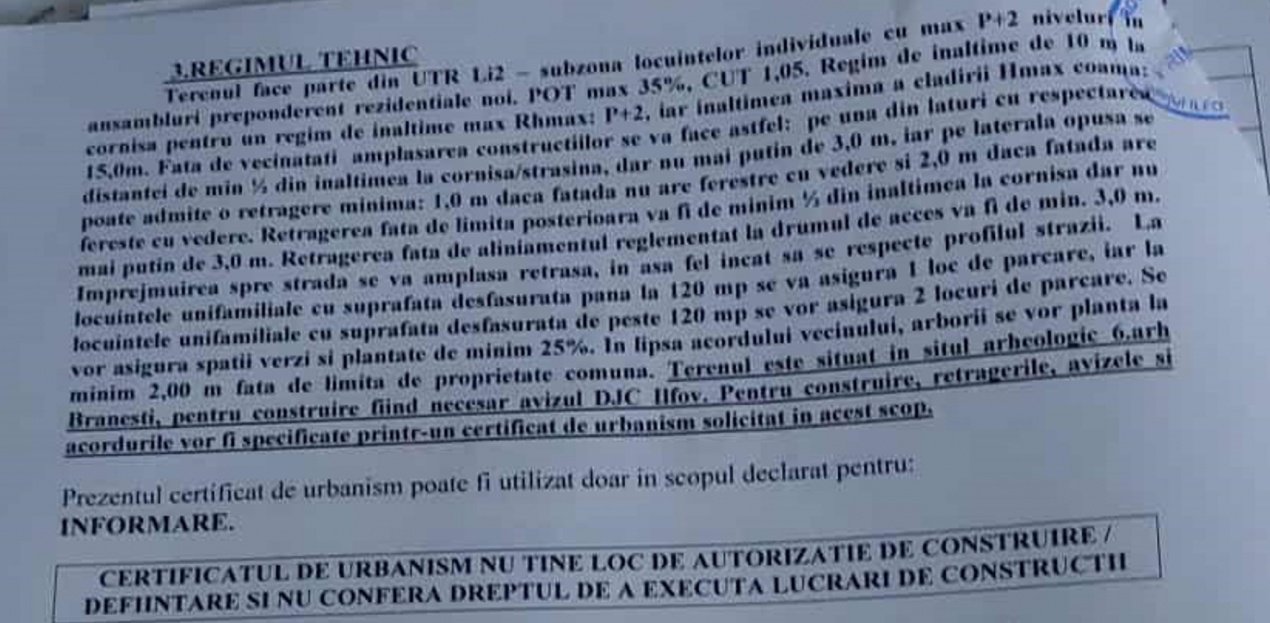 POT 35% /CUT 1.03/ H max 10 M Utilități: Curent electric disponibil la stradă Drum asfaltat, acces facil pentru utilaje și transport Posibilitate de extindere a rețelelor pentru proiecte rezidențiale sustenabile