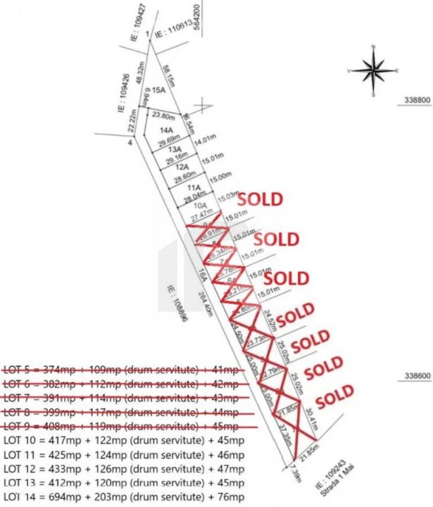 Teren intravilan situat in jud. Ilfov, oras Otopeni lotizat ideal pentru construirea unei noi locuinte foarte aproape de capitala. Suprafata totala a terenului este de 9526,52mp si este impartit in 15 loturi cu suprafete diferite, cel mai mic lot fiind de 378,6mp si cel mai mare de 694mp. Accesul la fiecare lot se face prin intermediul drumului de servitute, drum asfaltat, cu o latime de 7.39ml. Suprafata drumului este de 1844,14mp. Terenul beneficiaza de toate utilitatile:asfalt, gaz, curent, apa, canalizare. Utilitatile sunt aduse pe teren la fiecare lot in parte. Fiind situat pe str. 1Mai, intr-o zona care este in continua dezvoltare, aproape de centrul Orasului Otopeni, va puteti bucura de liniste si intimitate. Acces facil DN1, Centura Bucuresti, Autostrada A3, statii de autobuz. La doar 2 minute de mers pe jos regasim Penny Market si Parcul 1 Mai. Pentru cei interesați de achiziționarea unui singur lot sau a mai multor loturi, echipa New Land va poate sprijini in obtinerea certificatului de urbanis, a avizelor si a autorizației de construire. LOT 10 = 417mp + 122mp (drum) + 45mp (parc) LOT 11 = 425mp + 124mp (drum) +46mp (parc) LOT 12 = 433mp + 126mp (drum) +47mp (parc) LOT 13 = 412mp + 120mp (drum) +45mp (parc) LOT 14 = 694mp + 203mp (drum)+76mp (parc)